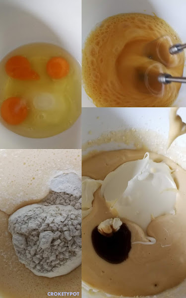 Añadimos la harina, mezclamos, luego el queso mascarpone, la esencia de vainilla y mezclamos bien.