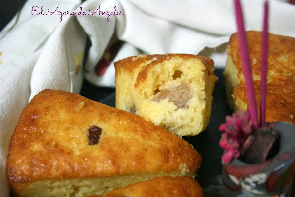 El bizcocho es una masa base de yogur de pera ,después le puse trocitos de pera a unos trozos, pasas a otros y pepitas de chocolate a los últimos.