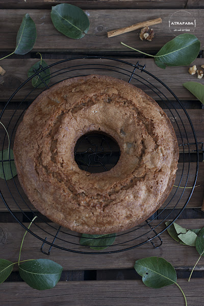 Mezclamos bien las peras con la mezcla y una vez integrado todo añadiremos esta mezcla en la de harina, removiendo bien con una espátula hasta que quede totalmente integrado y los ingredientes secos se hayan integrado en los húmedos. Vertemos la mezcla en el molde y horneamos durante una hora aproximadamente, o hasta que al pinchar con una brocheta ésta salga limpia. Sacamos el molde del horno y antes de desmoldar dejamos unos diez minutos dentro. Desmoldamos y dejamos enfriar sobre una rejilla.