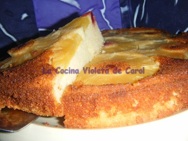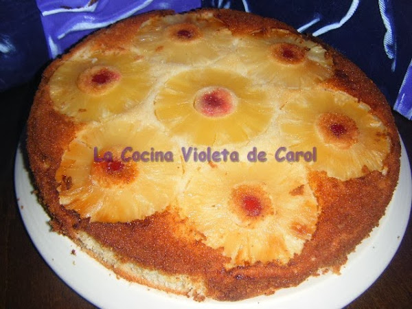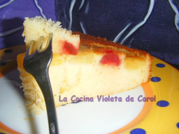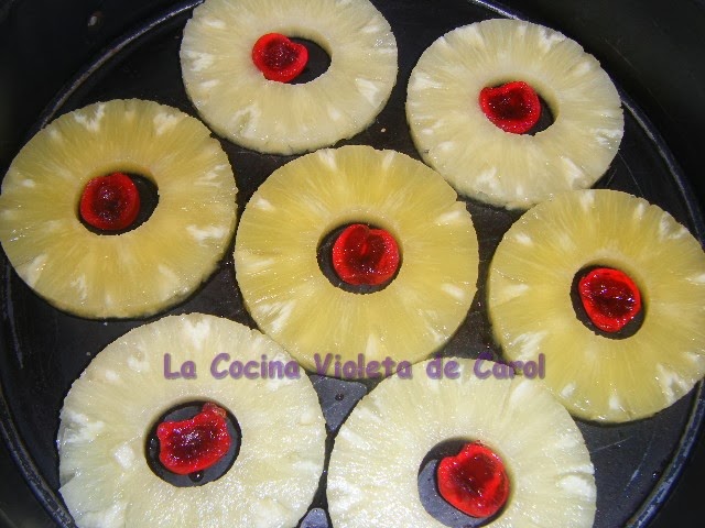 En el molde colocamos las rodajas de piña y en cada agujero una guinda (como podés ver en la foto). Ponemos en el molde la mezcla y horneamos durante 40 minutos.