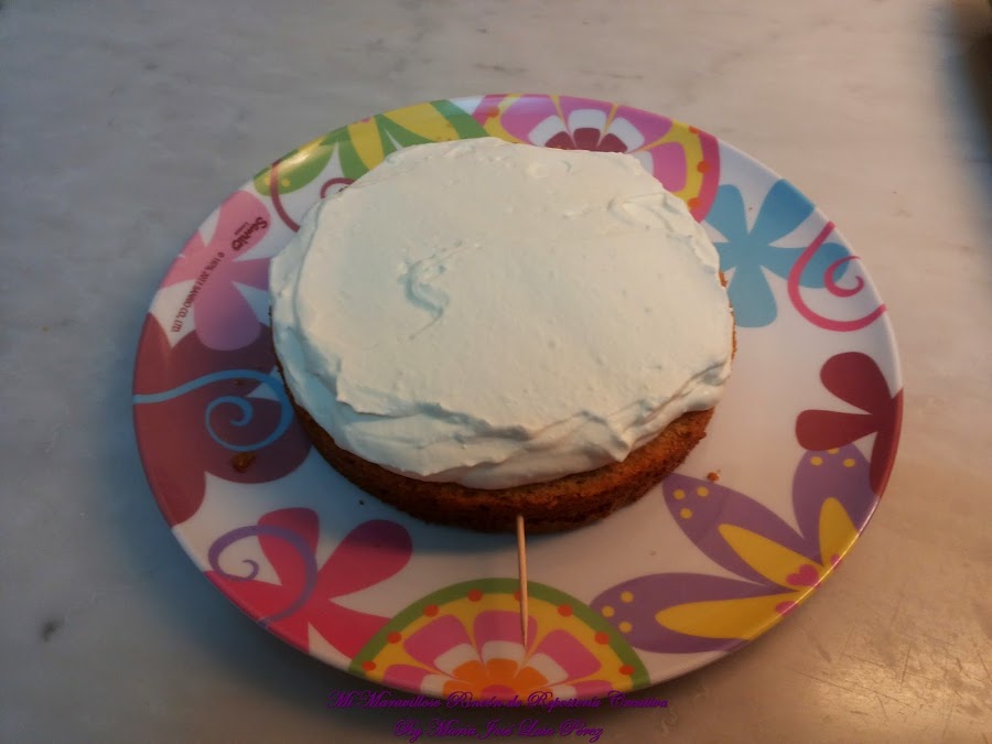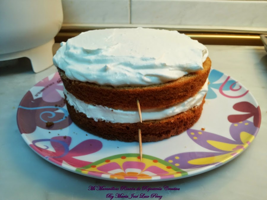 Colocamos el siguiente bizcocho, rellenamos con la nata montada (crema de leche)...