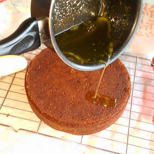 Mientras enfría hacemos un almibar con el azúcar y el zumo de naranja y lo vertemos sobre el bizcocho.