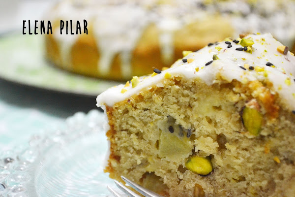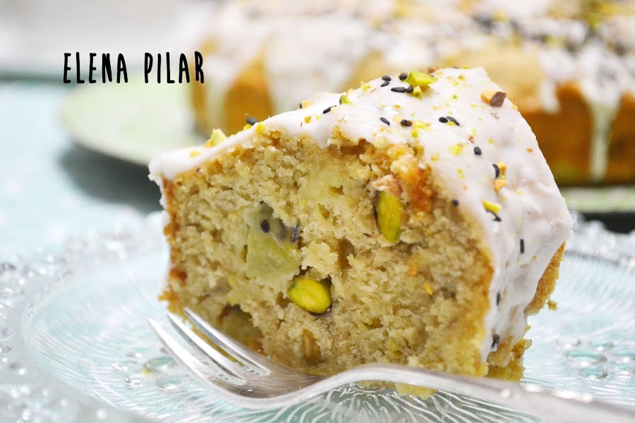 Para darle un poco de textura a la masa, contiene una buena cantidad de pistachos. Yo los dejé enteros; a estas alturas es por todos conocida mi querencia por los trozos grandotes de frutos secos y/o chocolate y/o fruta en cualquier masa. Pero, si no os resulta agradable encontrar trozos entre la miga, siempre podéis picarlos finamente.