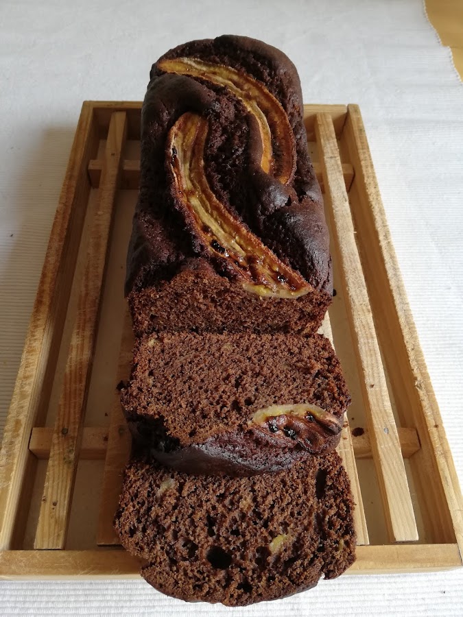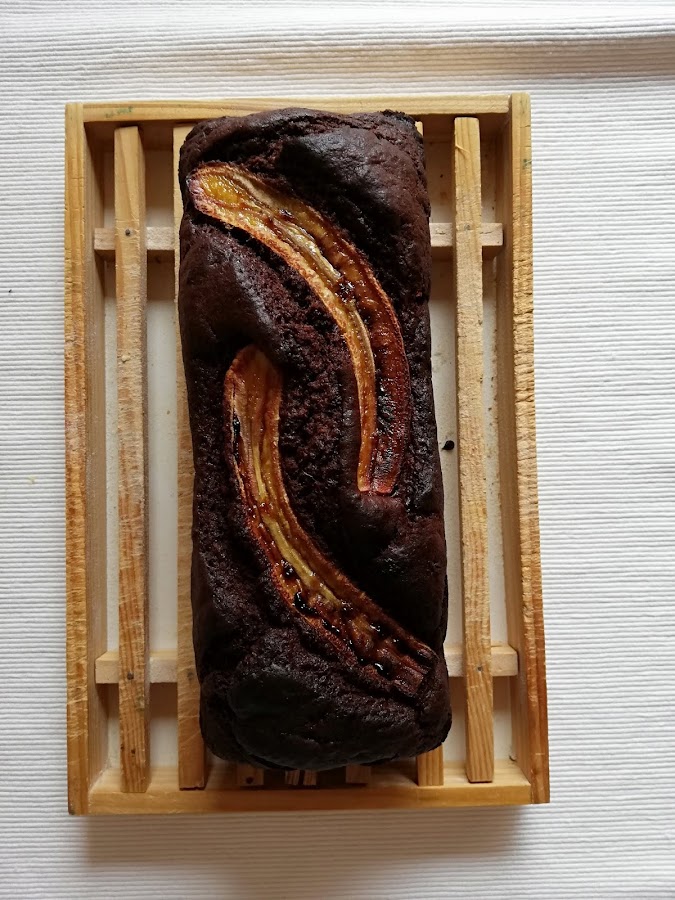 3. Añadimos a esta mezcla la harina y la levadura y mezclamos bien hasta que esté todo integrado. Añadimos las pepitas de cacao y cacao en polvo al gursto. Volvemos a integrar todo y lo veretemos en un molde rectangular.