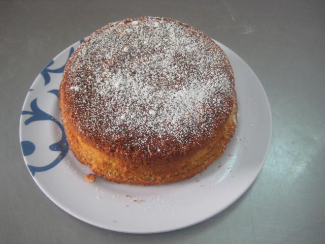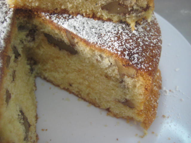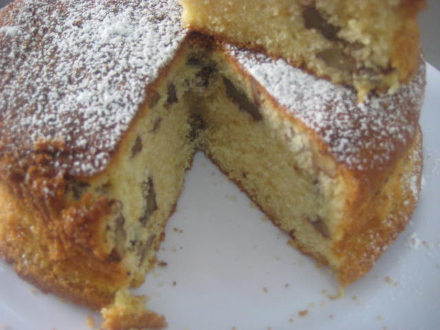 Preparación: En el bol de la batidora o en un bol para hacerlo a mano montar los huevos con el azúcar y la esencia de vainilla o azúcar avainillado. Mezclar la harina con el impulsor y el pellizco de sal y reservar. Enharinar ligeramente las nueces y retirar el exceso de harina- Una vez que tenemos los huevos montados, incorporar poco a poco la harina, sin dejar de batir, si se hace en máquina a velocidad lenta o media, Seguidamente agregar el aceite a hilo fino igualmente sin dejar de batir lentamente. Reducir los plátanos a puré, machacándolos con un tenedor y añadir, ya a mano a la mezcla anterior. Por último agregar las nueces y mezclar suavemente para que se distribuyan. Engrasar el molde que deseemos con mantequilla y harina o bien con un spray desmoldante y verter la mezcla en él. Cocer a 190 º entre 45 y 50 minutos. Una vez hecho. Dejar templar, desmoldar y dejar enfriar sobre rejilla. Espolvorear con azúcar glas. Yo lo he hecho en un molde redondo.
