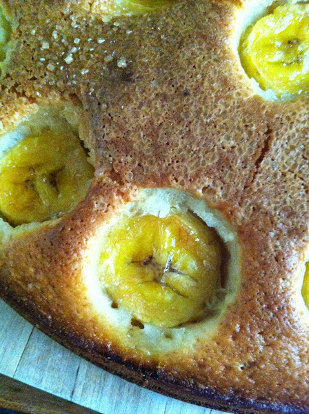 Añadimos la harina con la levadura . Metemos en el molde y por encima ponemos los plátanos previamente cortados en rodajas y azúcar moreno .