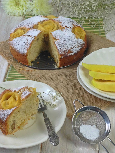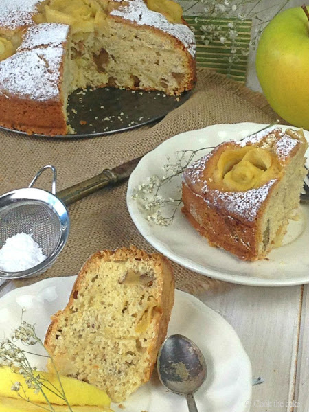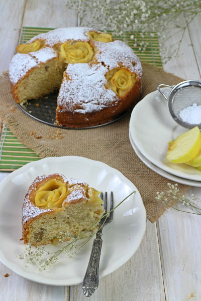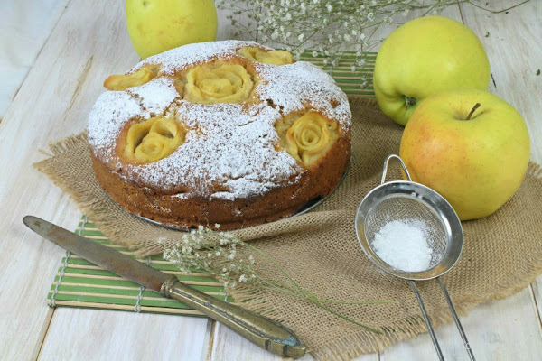 Pero centrémonos en el bizcocho de hoy que es un bizcocho riquísimo, jugoso y que como elemento decorativo tiene esas flores hechas también con manzana que le dan un aire rústico y a la vez elegante. Sólo hay que tener un poco de paciencia a la hora de ir formando las rosas con las láminas de manzana. Es algo parecido a hacer rosas con fondant, hay que ir colocando pétalo por pétalo.