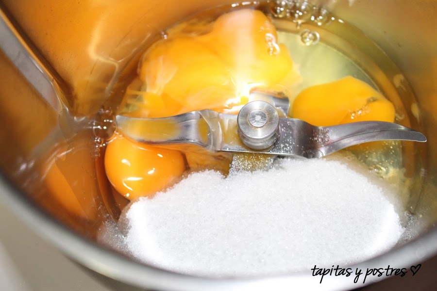 Con la batidora eléctrica blanqueamos los huevos con el azúcar hasta que queden cremosos. Vamos añadiendo el resto de los ingredientes en el mismo orden y batiendo hasta que se integren bien.