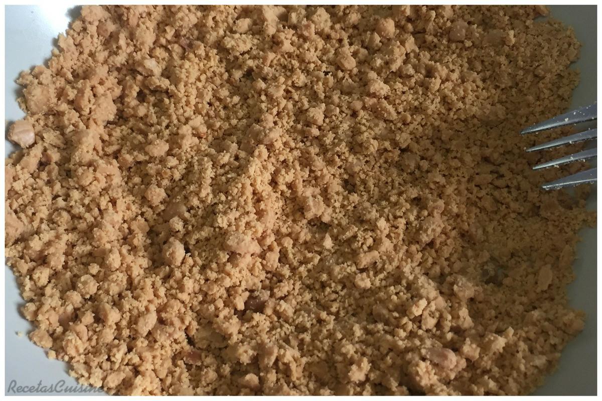 4. En un plato, desmenuzamos bien el turrón con un tenedor mismo. Lo añadimos al bol y programamos velocidad 6, 1 minuto.