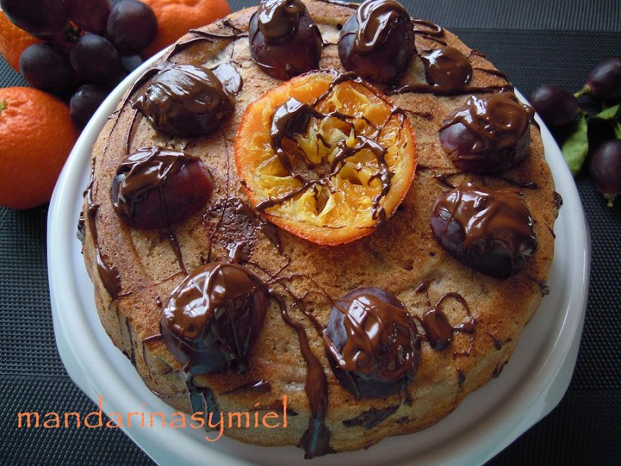 He adornado el bizcocho con granos de uva y una rodaja de mandarina caramelizada, luego he echado por encima un poco de chocolate.