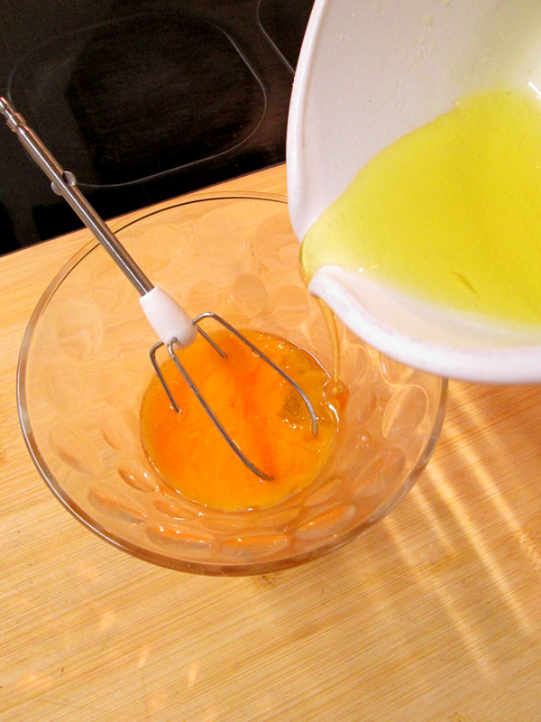 - Añade cacitos de la mezcla de las yemas y sigue batiendo . Hazlo poco a poco, hasta que no esté integrado el líquido del cazo no sigas añadiendo.