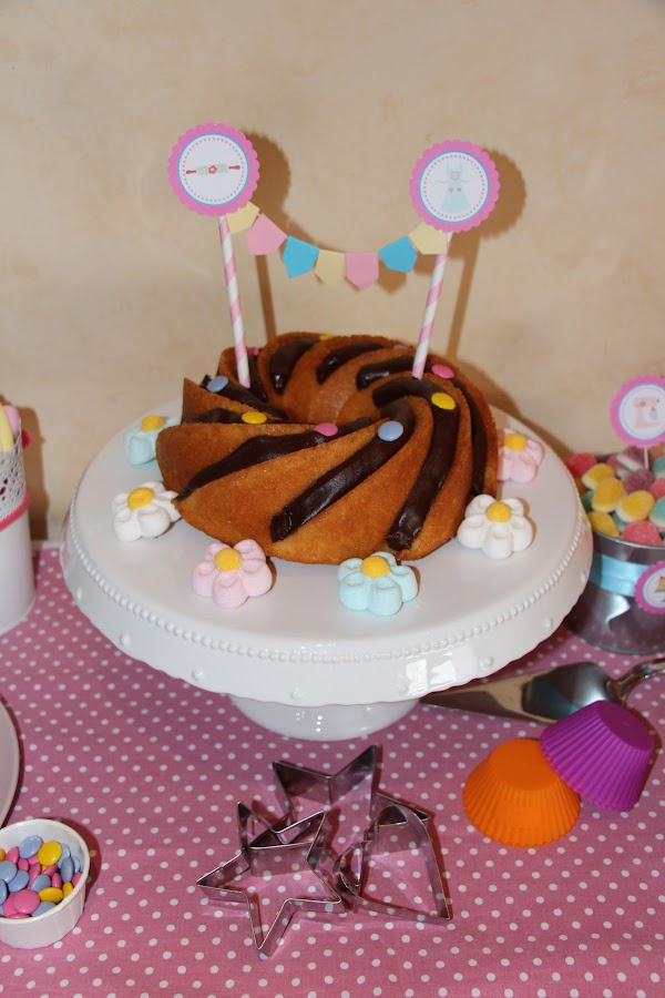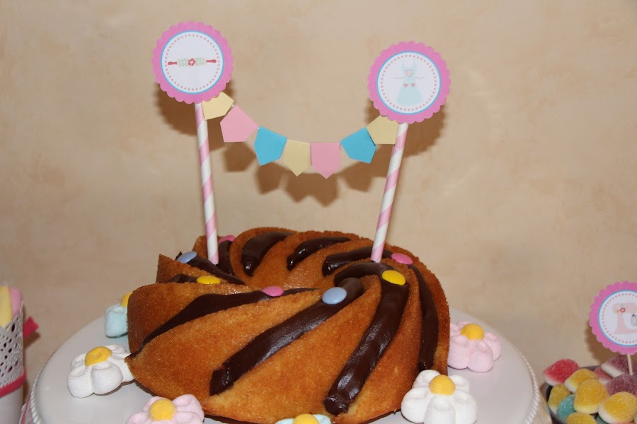 El topper que hice fue acorde con la temática de la fiesta repostera. En el interior de un par de pajitas rayadas en rosa y blanco, puse un brocheta en cuyo extremo enganché dos círculos festoneados con motivos cocineros, y uní las dos pajitas con una guirnalda en tonos pastel.