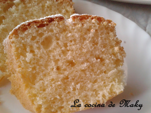 Queda un bizcocho muuuuyyy tierno y esponjoso, el interior parece una nube. Las fotos son malísimas, pero el bizcocho estaba de muerteeeeeeeee.
