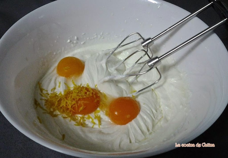 Añadimos el aceite y el yogurt, batimos unos segundos, y echamos la raspadura de limón y la harina mezclada con el royal. Batimos de nuevo para que se mezclen bien todos los ingredientes