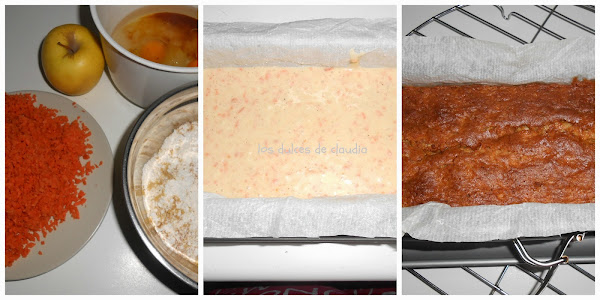 Batir los huevos, aceite vainilla y azúcar hasta formar una crema. Añadir los ingredientes secos y por último la manzana y la zanahoria.