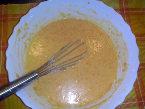 Vamos añadiendo los huevos uno a uno e integramos. (Si quisiéramos usar azúcar, este es el momento en el que la echaríamos, utilizando la misma cantidad que de zanahoria, que en este caso serian 150 gr)