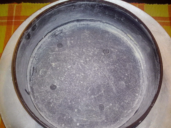 Ahora untamos con mantequilla el molde donde vamos a hornear nuestro bizcocho. Yo he usado uno de 20 cm. Y lo espolvoreamos con harina, pero sin que se nos apelmace.
