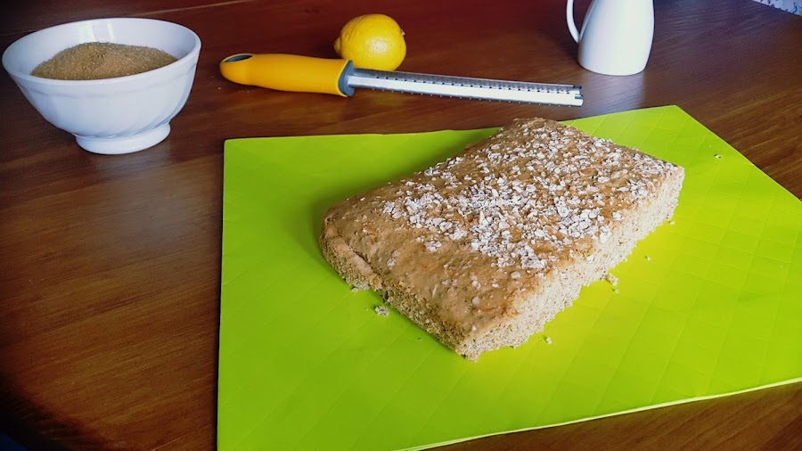 Untar con mantequilla el molde. Verter la masa en él. Yo le espolvoreé con unos copos de avena antes de meterlo en el horno.