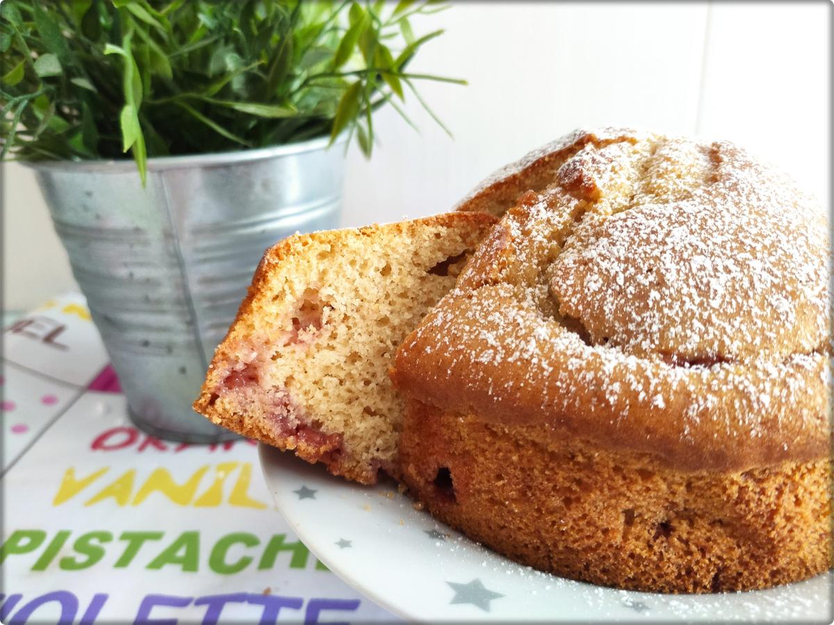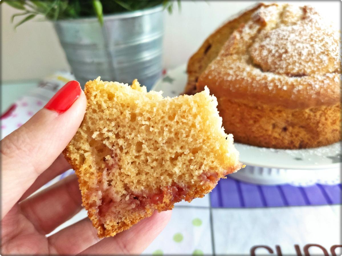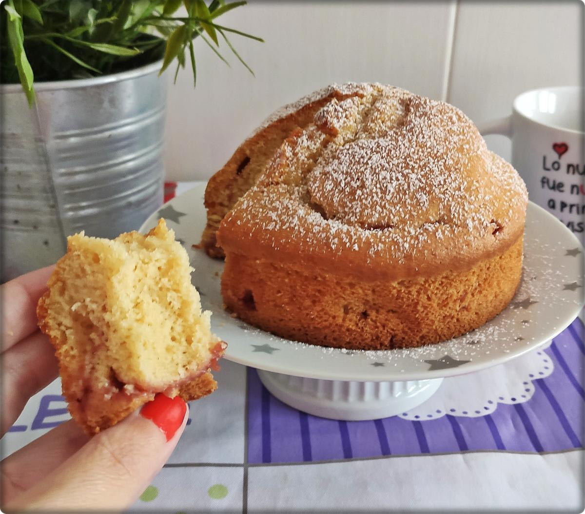 La receta la vi en un video en youtube que aquí os dejo. La verdad que me llamó mucho la atención que llevara la mermelada dentro de la masa y me parecía raro que no se bajara…. pues bien, a mi si que se me bajó y es que la masa no es tan espesa como para que la sostenga o tal vez puse la capa de abajo demasiado fina… no lo se. Ese mismo canal tiene otra versión en la que hacen un el mismo bizcocho pero con el doble de ingredientes y en esa primero hornean 1/3 de la masa durante unos minutos, luego le ponen la mermelada y encima el resto de la masa. A mi personalmente esa versión me convencía menos, así que opté por esta.