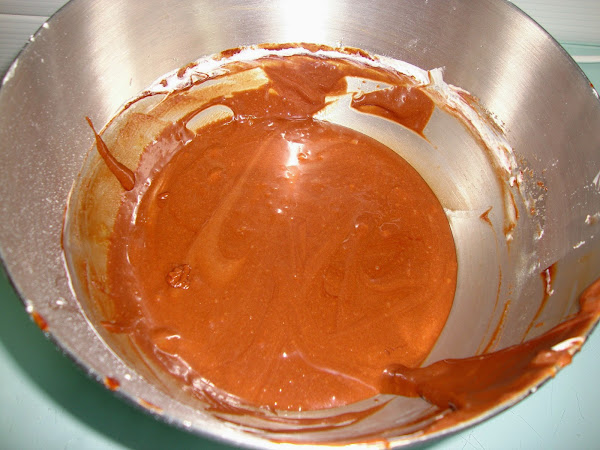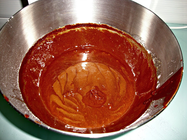 Luego vamos batiendo añadiendo alternativamente la harina y el chocolate fundido y finalmente le agregamos la nata (crema de leche).
