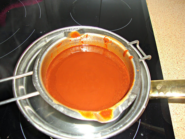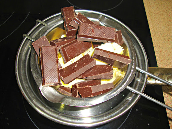 Primero fundimos el chocolate con la mantequilla al baño María (también se puede hacer en el microondas) y dejamos entibiar.