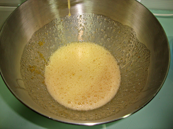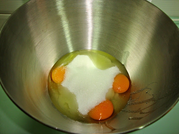 En un bol ponemos los huevos con el azúcar y batimos hasta que aumenten su volumen y estén espumosos.