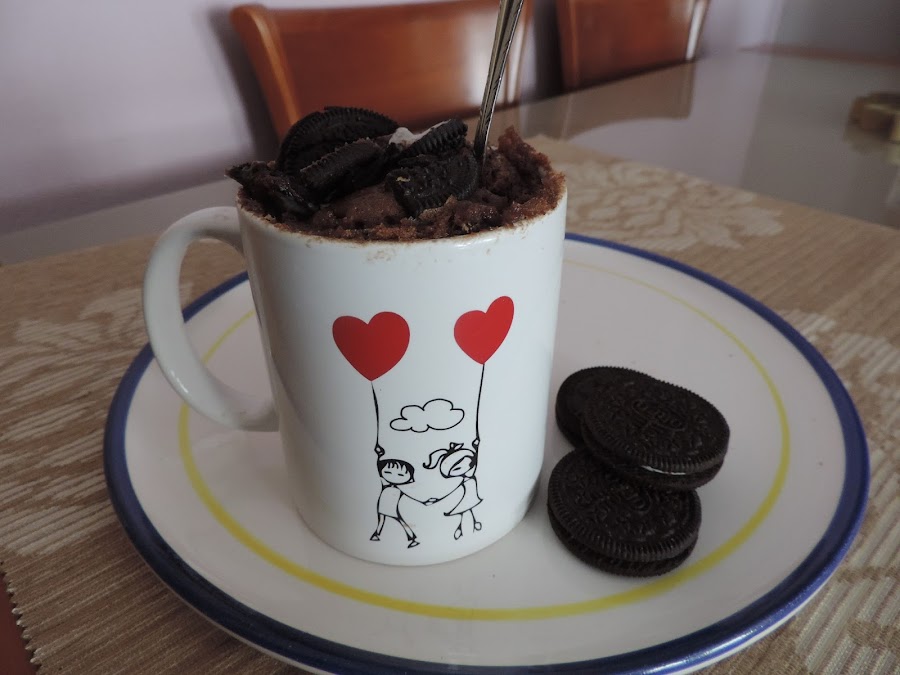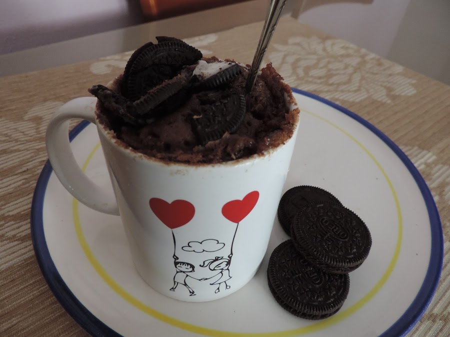 En una taza de 300 ml. añadir una cucharada de mantequilla, derretirla al microondas durante 30 segundos, después añadir 1 cucharada de azúcar y un huevo y remover bien con un tenedor, después añadir las 3 cucharadas de harina y la cucharadita de levadura, remover muy bien hasta no tener grumos, añadir 2 cucharadas de nata (crema de leche), y 1 cucharada de cacao en polvo y remover muy bien, cuando ya no haya grumos añadir 4 galletas de oreo a trocitos.