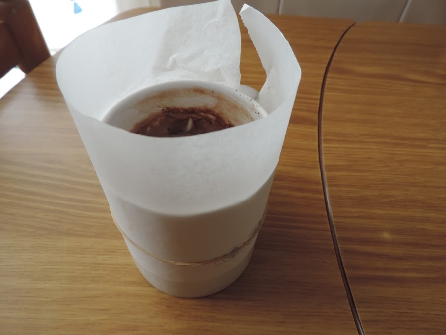 Ponerle a la taza, una tira de papel de hornear, sujeta con una goma, para que no se salga el bizcocho en el microondas.
