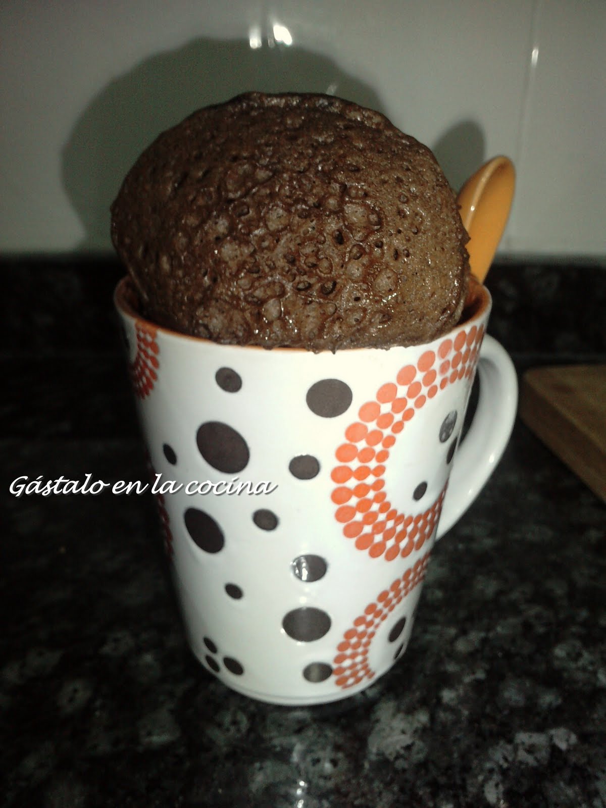 Lo único que he cambiado para darle un poco de untuosidad y humedad ha sido rellenarlo de chocolate cremoso, todo un acierto! Ingredientes: 1 huevo2 cucharadas soperas rasas de azúcar (rasa es que no haga montañita en la cuchara)2 cucharadas soperas rasas de cacao4 cucharadas soperas rasas de harina1 cucharada de café rasa de levadura4 cucharadas soperas de leche3 cucharadas soperas de aceite1 taza que pueda meterse en el microondas (taza mejor que vaso ya que subirá bastante y puede derramarse) Preparación: En la taza batir el huevo, añadir el azúcar, remover, añadir la leche y el aceite, remover, añadir el cacao tamizado, la harina y la levadura y mezclar bien con un tenedor hasta que no haya grumos.Meter en el microondas a máxima potencia 3 minutos. Nota: Si lo dejamos más tiempo se quedará seco. Podemos hacerlo sin chocolate, simplemente cambiaremos las cucharadas de cacao por 2 más de harina.En mi caso una vez hecho con una boquilla de relleno y una manga pastelera lo he rellenado hasta el fondo con chocolate líquido especial gofres, aunque también lo he probado poniendo 2 pastillas de chocolate justo antes de meter en el microondas y queda igual de bien.