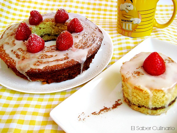 5. Glaseado de ron. Mezclamos bien el azúcar glas con el agua y el ron. Decoramos el bizcocho con esta glasa y con unas fresas. Puedes usar ron, otro licor o simplemente añadirle un poquito de vainilla líquida.Consejo: puedes añadirle al streusel de café unas nueces picadas y las especias que se utilizan para hacer el bizcocho de zanahoria.