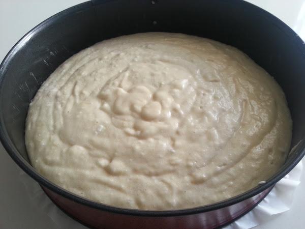 7. - Volcamos sobre un molde engrasado, o con papel de horno, yo hago las dos cosas, y metemos en el horno entre 30 y 40 minutos, esto dependerá del molde, el mío es de 24 cm y ha tardado 30 minutos. Si es más pequeño, será más alto el bizcocho, y tardará un poco más.
