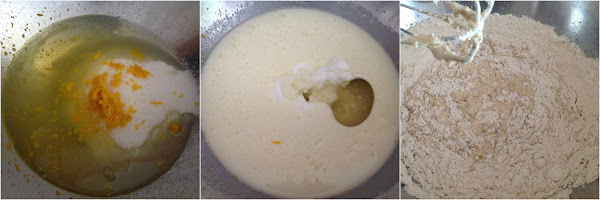 Ponemos en un bol las claras de huevo, el azúcar y la ralladura de naranja. Batimos durante 2 minutos y añadimos el yogur y el aceite. Volvemos a batir integrando los ingredientes. Agregamos la avena tamizada con la levadura y la sal mezclando bien.