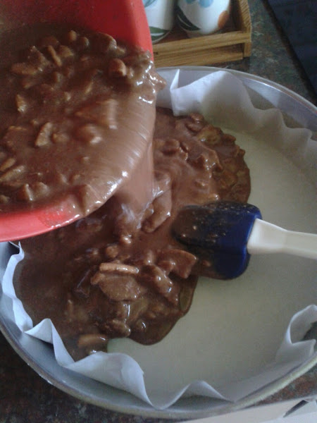 Volcamos la mezcla en un molde, este es de 26cm, forrado con papel vegetal, llevamos al horno precalentado a 180º durante 30/40 minutos, depende de cada horno.