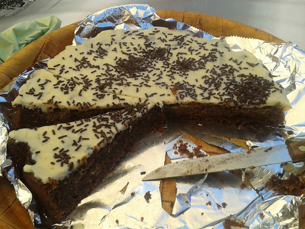 ** Esta decoración ya es cosa mia, derreti 2 tabletas de chocolate blanco en el microondas (con cuidado, porque este chocolate es muy sensible) lo esparci por encima del bizcocho y le puse por encima fideos de chocolate, espero que os guste. A DISFRUTARR!!!!!!!!