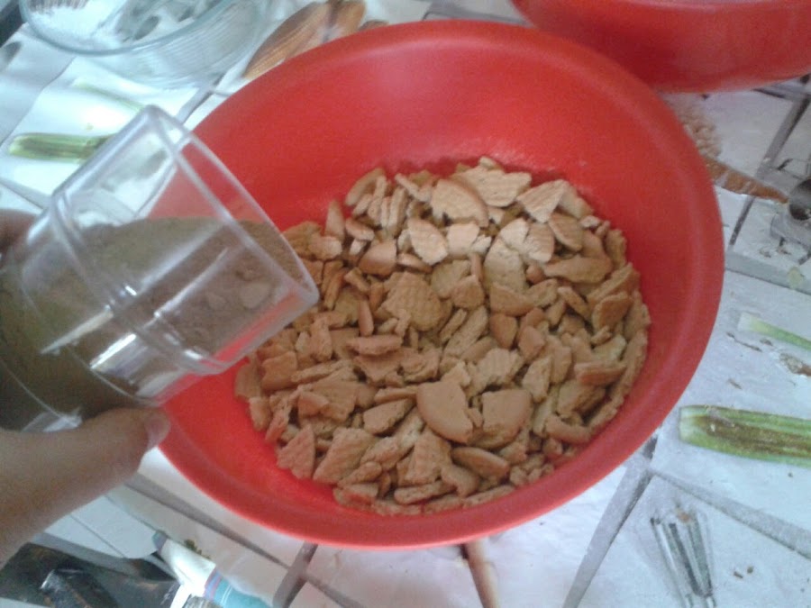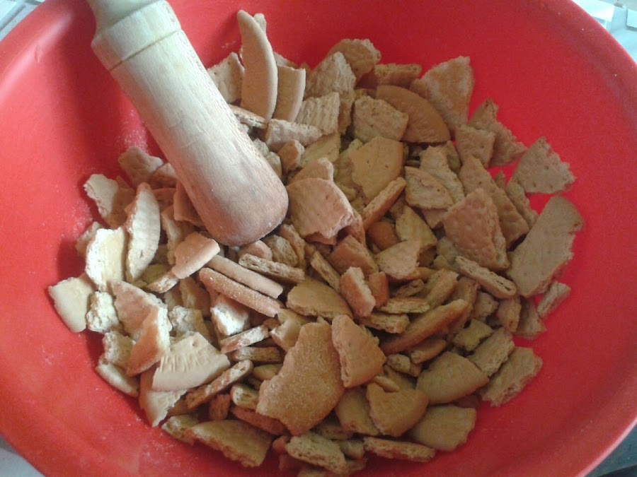 Primero en un bol ponemos las galletas y las chafamos un poco, que luego notemos la galleta en el bizcocho