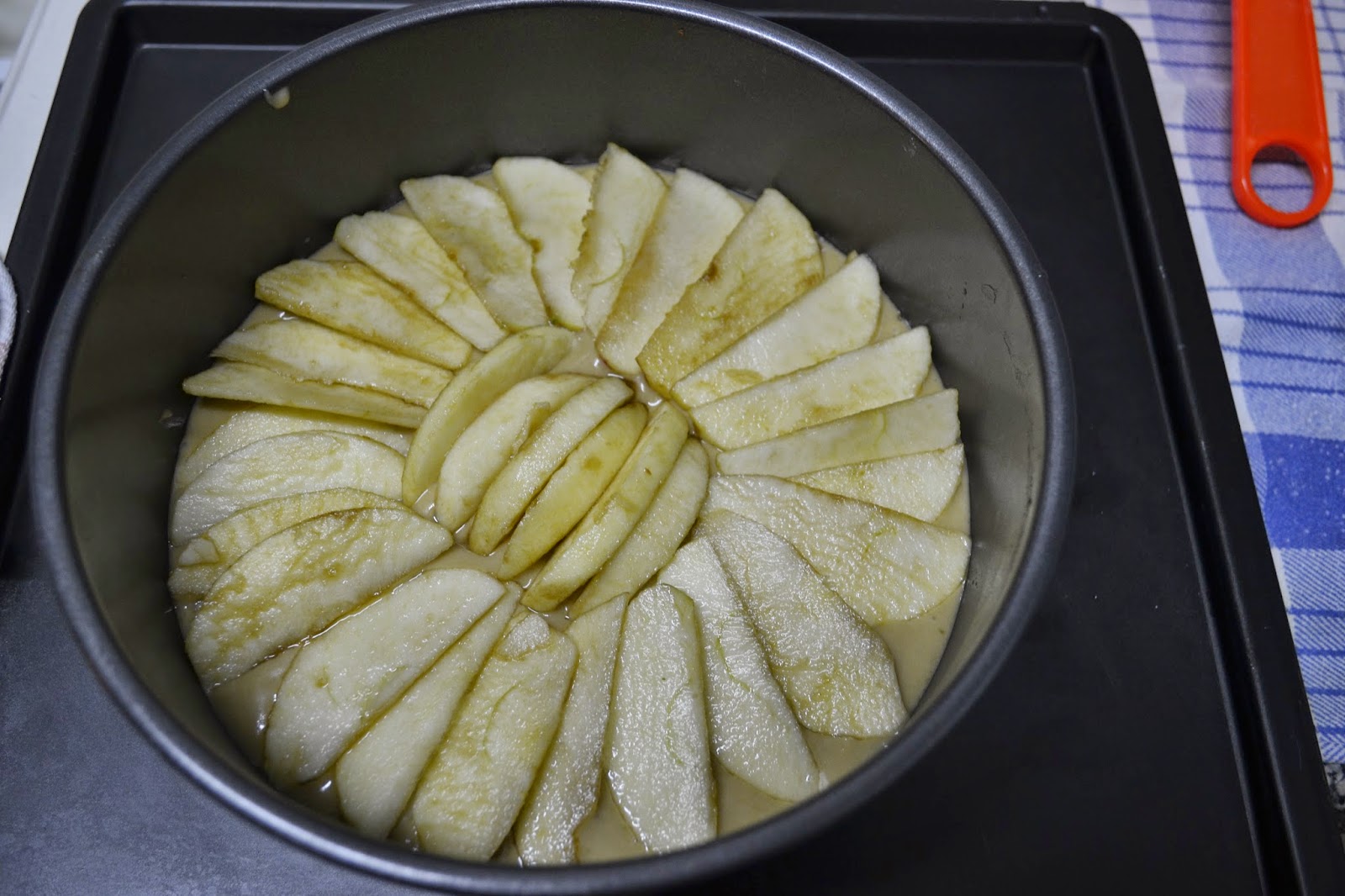 Pasa la mezcla a un molde previamente engrasado y reparte los gajos finos de manzana por encima, así como se ve en la foto.