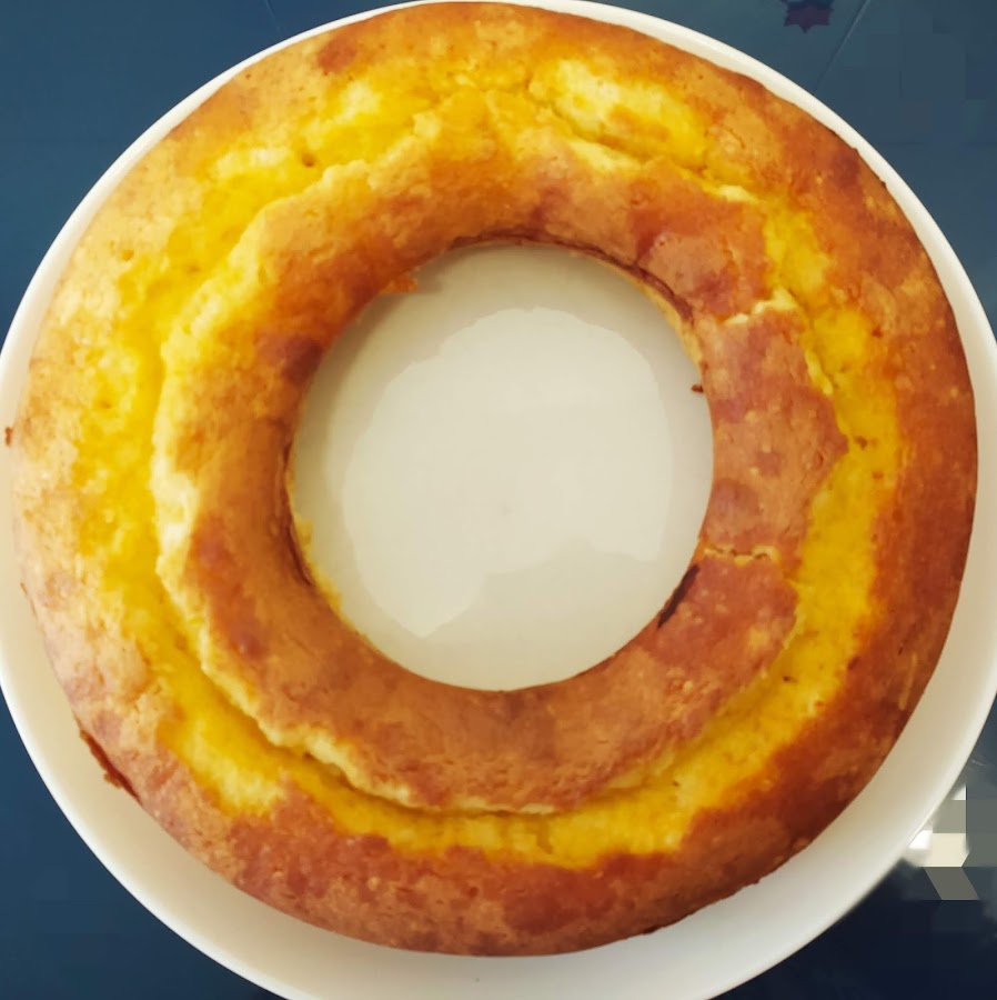 Hemos utilizado un molde pequeño de corona, ella utiliza uno de 15 cm. Nosotros no hemos hecho el glaseado final para el que ella utiliza el zumo de una mandarina.