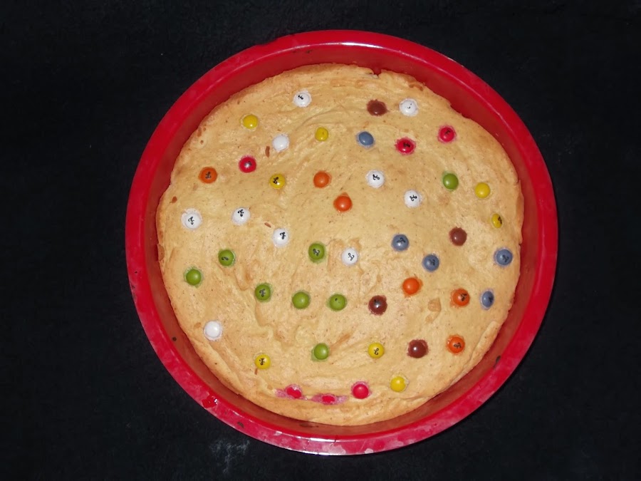 Ponemos mantequilla en el molde que vayamos a utilizar y echamos la mezcla. Igualamos la superficie y colocamos los lacasitos. Mientras encendemos el horno a 180º. Una vez que esté caliente metemos nuestro molde con el bizcocho y lo dejamos durante 25 minutos. Pinchamos con un cuchillo para ver si sale limpio y lo sacamos del horno. Dejamos enfriar y ya está listo para comer.