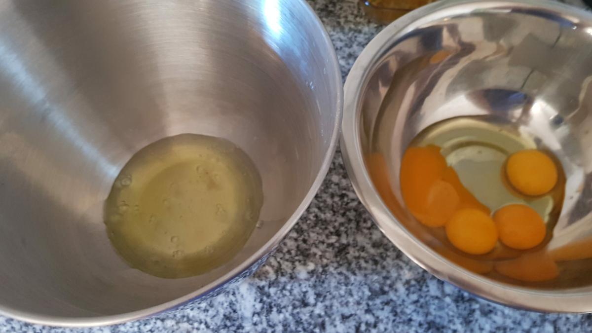 Los huevos Separamos las yemas de las claras de tres huevos, y el último lo añadimos entero con las yemas.