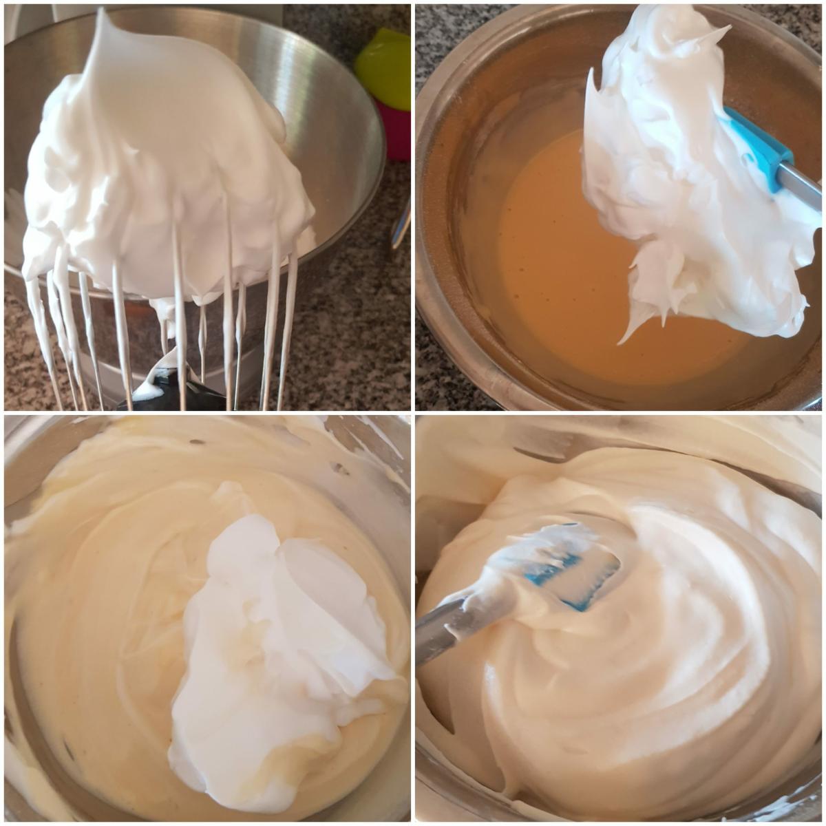 Mezclar las yemas con las claras Una vez tengáis las claras a punto de nieve, iremos incorporándolas de poco a poco a las yemas con movimientos envolventes, sin sobre batir para que no se nos baje la masa y asegurándonos que queda todo bien incorporado.