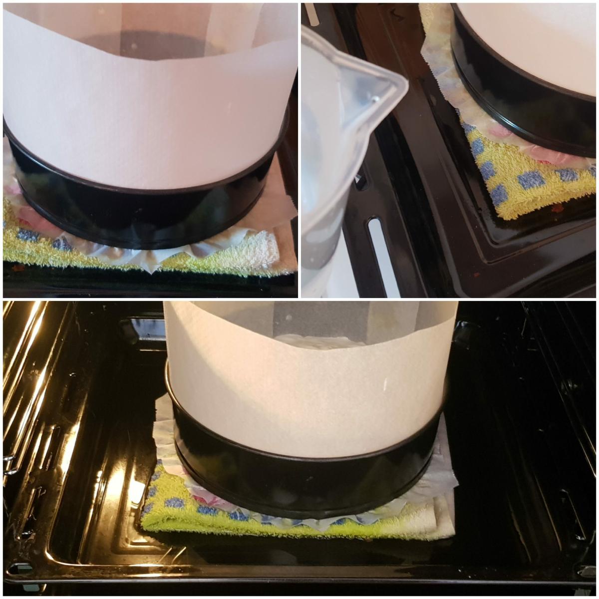 Al horno Con el horno precalentado a 160ºC, con calor arriba y abajo sin ventilador, introducimos el molde, que lo haremos con una bandeja con agua caliente y un trapo y el molde encima, como al baño maría, y lo dejaremos 30 min. Sin abrir el horno, bajamos la temperatura a 130ºC y dejamos unos 30 minutos más. En este punto abriremos el horno y pincharemos con un palillo, si el palillo está limpio es que ya está, si no, dejaremos unos minutos más.
