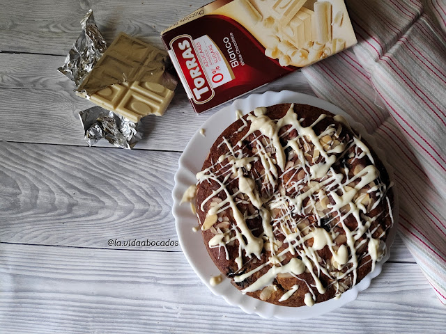 Cuando el bizcocho esté frío, puedes decorar derritiendo media tableta de chocolate blanco sin azúcar (yo uso el de la marca Torras que suele estar en grandes superficies) con una cucharadita de aceite de coco o mantequilla. Derrite en el microondas a intervalos de 30 segundos, moviendo bien entre intervalos para evitar que se queme.