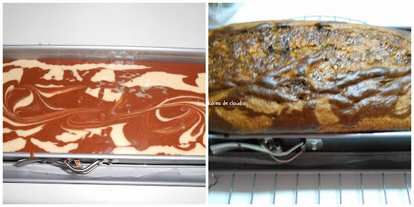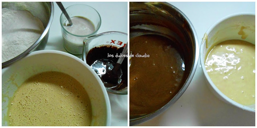 A una agregarle una mezcla de harina y a la otra la otra mezcla del cacao.