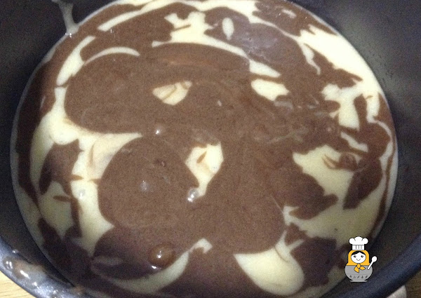 Engrasamos un molde con mantequilla y vertemos simultáneamente las dos masas.