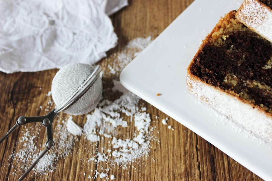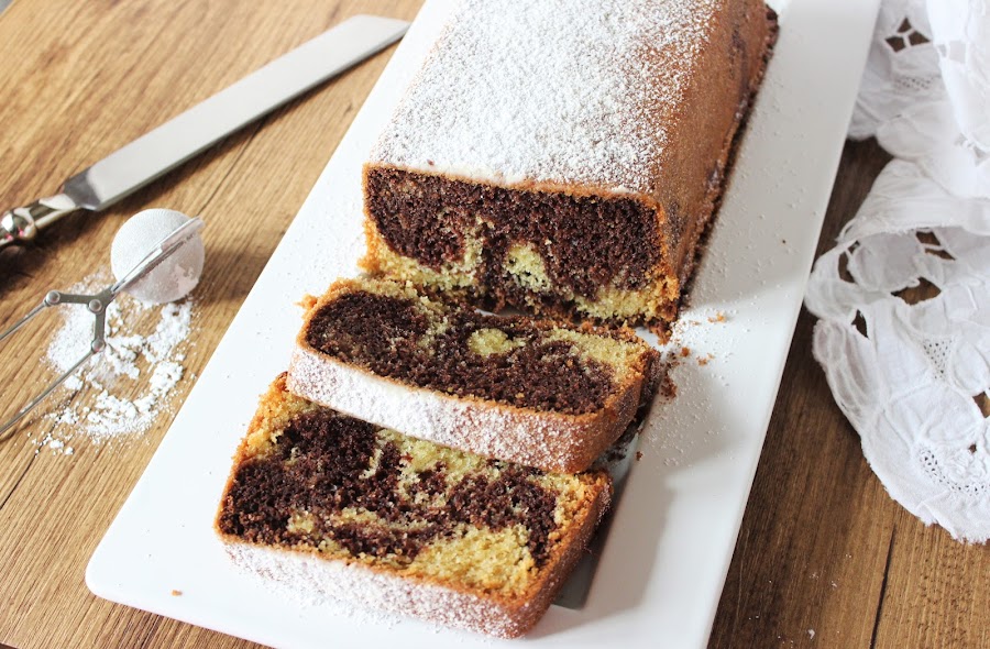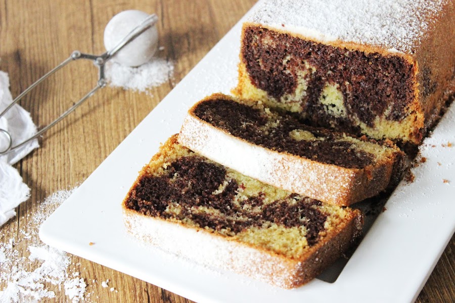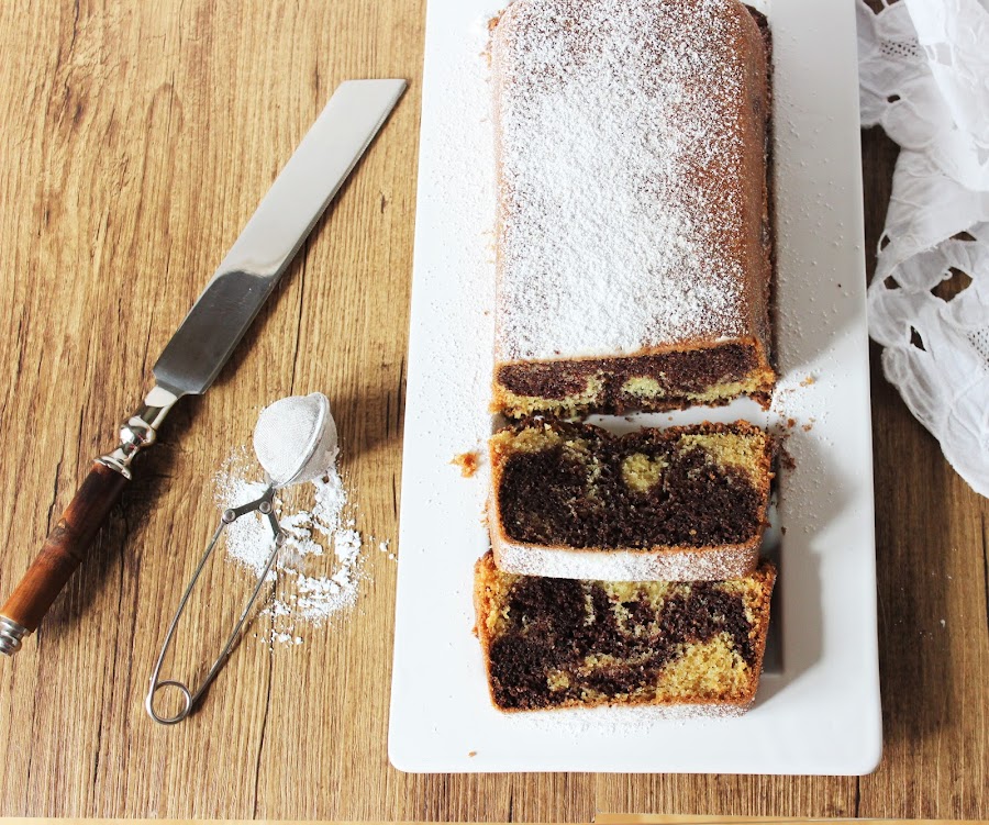 Se prepara una masa con mantequilla, huevos, azúcar, harina y vainilla, y después solo tienes que apartar un poco menos de la mitad de la masa y añadirle cacao. Se juntan en el molde las dos masas y se remueve ligeramente y así es como consigues el efecto marmolado. Súper fácil ... ¿a que sí?.