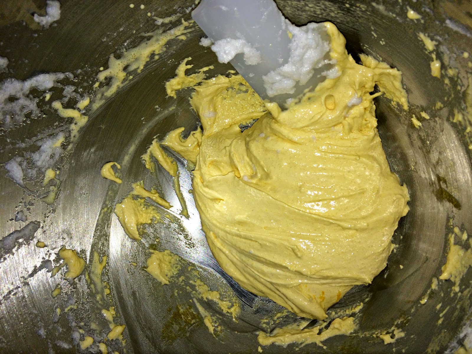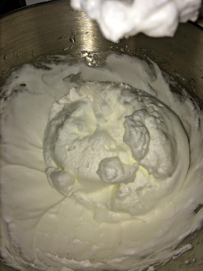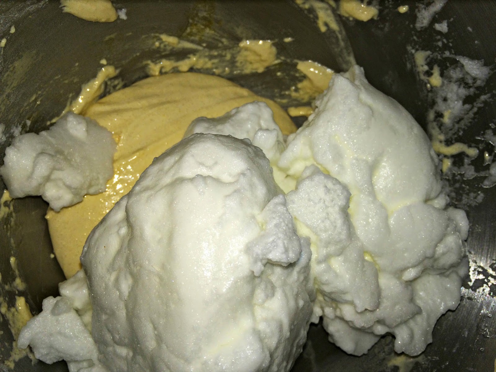 Como veis queda una masa uniforme y bien ligada, que mezclaremos con las claras, lo haremos con la espátula haciendo movimientos envolventes para que las claras no se caigan y se mezclen totalmente.