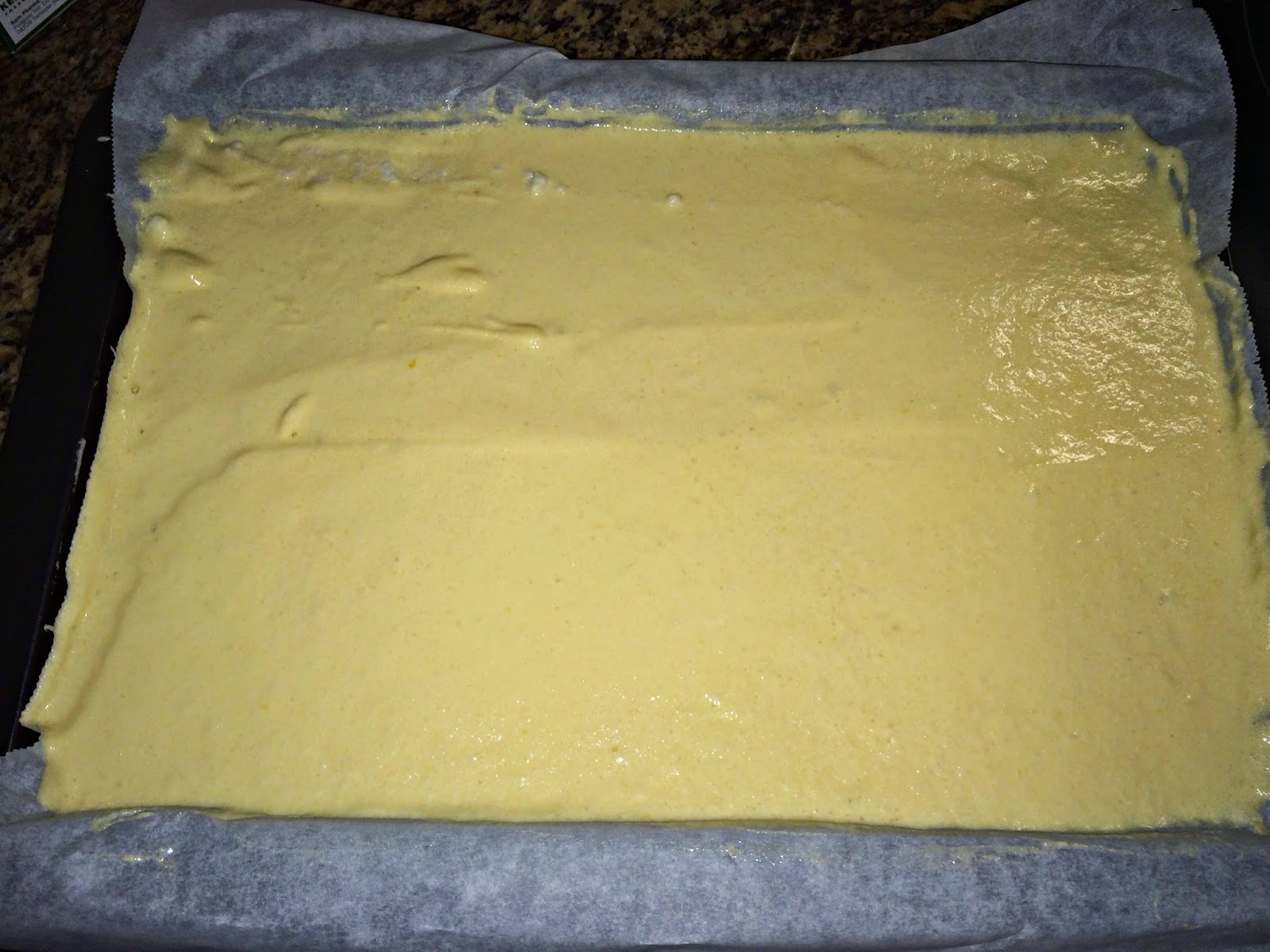 Prepararemos la bandeja para el horneado poniendo papel vegetal. La bandeja ha de ser rectangular y bajita. Ponemos papel de hornear para luego enrollar el bizcocho con el. Una vez esté preparada la masa, la extendemos en la bandeja de horno, y la alisamos para que quede igualada.
