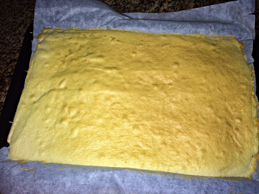 Vamos a hornear el bizcocho a 170ºC durante 8 minutos exactos, al ser una masa tan fina se puede quemar enseguida. En cuanto pasen los 8 minutos sacamos la bandeja del horno, y sacamos el bizcocho con el papel de la bandeja. Dejaremos que se temple unos minutos.