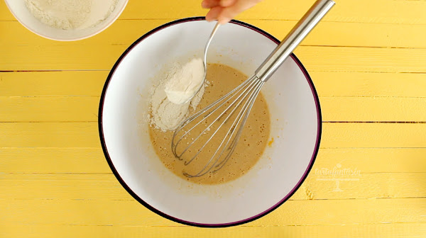 y una vez integrado empezaremos poco a poco a añadir a la masa la harina con levadura