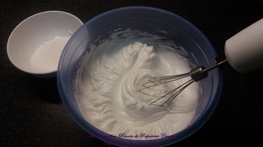 Cuando empiece a espumar, añadimos el resto del azúcar en forma de lluvia, sin dejar de batir, para conseguir montar las claras a punto de nieve.